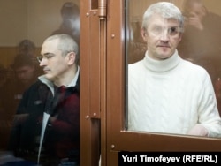Михаил Ходорковский жана Платон Лебедев Москва сотунун ок өтпөс айнек "торунун" ичинде.31-март 2009-жыл.