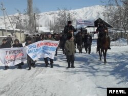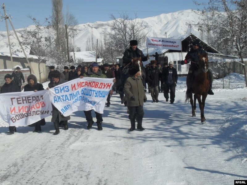 Чогулган эл стадионго жөө жүрүш жасап, Исаковдун боштондугун талап кылган ураандар менен барды: